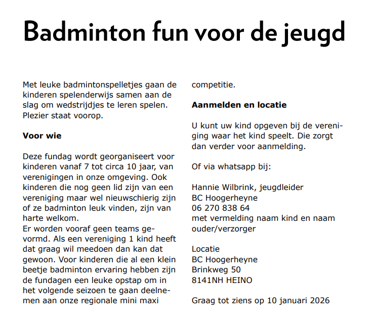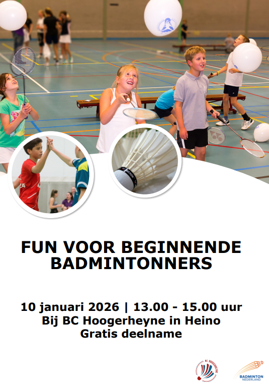 | BC Hoogerheyne - Heino | 10-01-2026 | Jeugd Badminton Fun | 13.00 -15.00 uur |