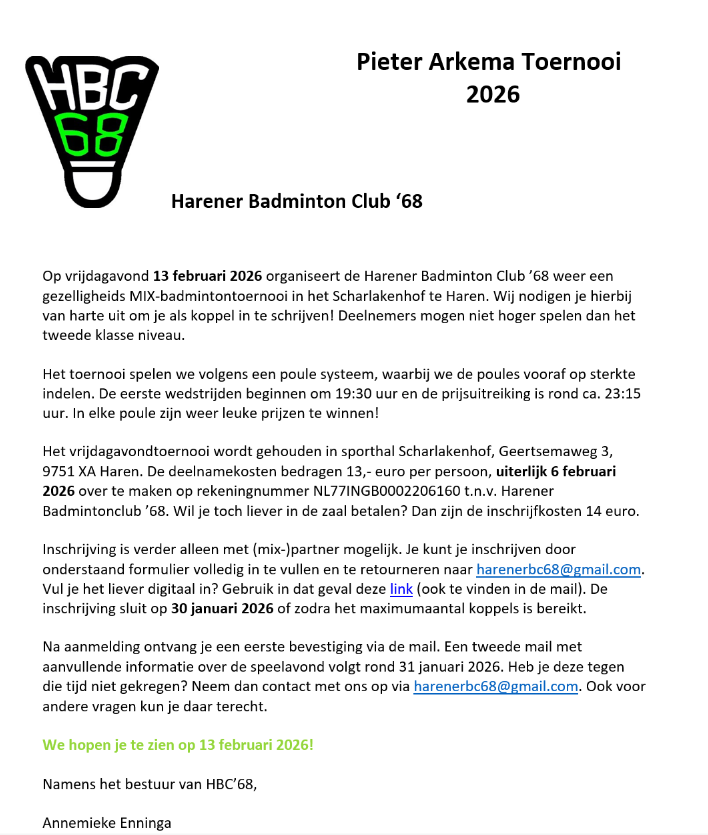 | HBC '68 - Haren | 13-02-2026 | Pieter Arkema Toernooi | 19.30 - 23.15 uur |